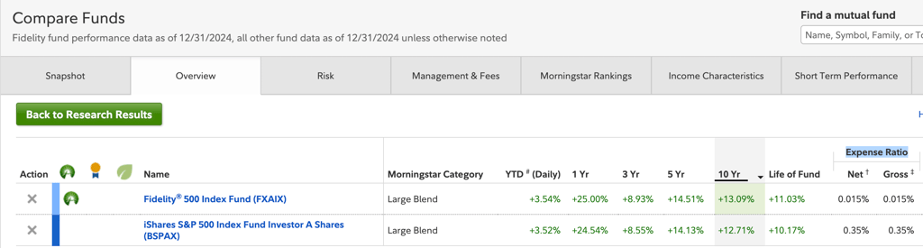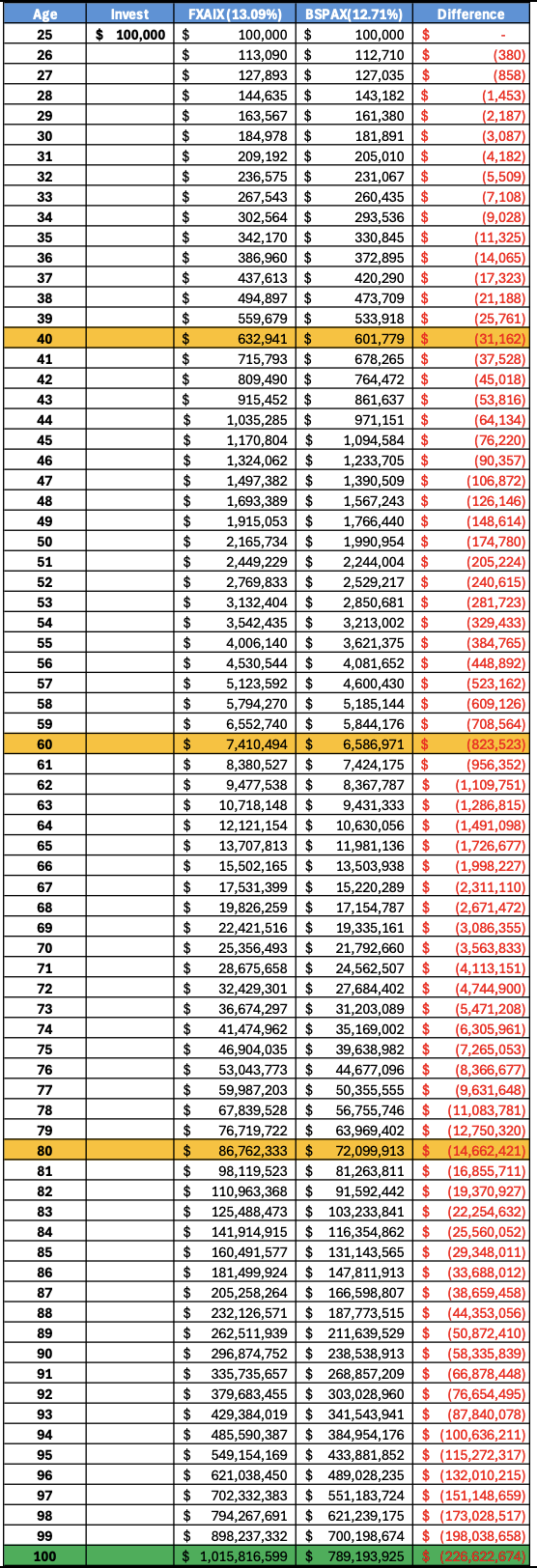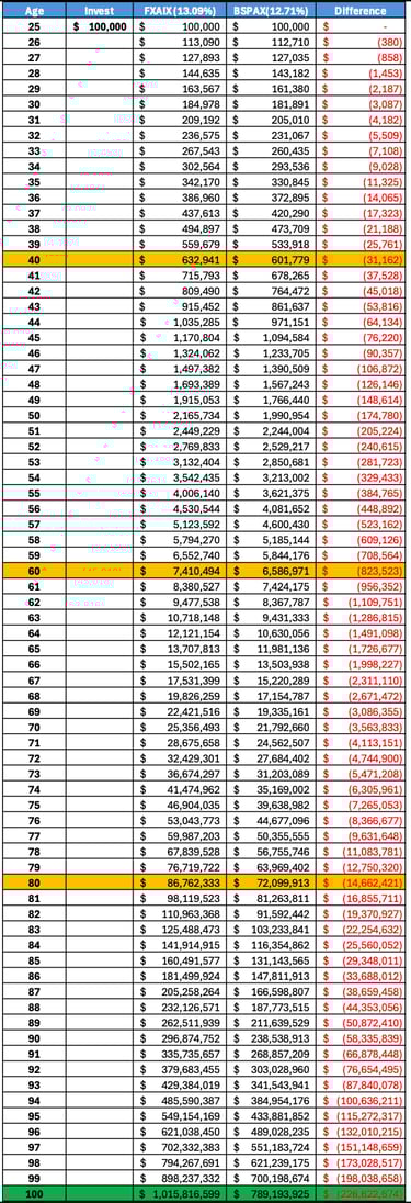 Visualization Created for Megan & Chris : Megan and Chris both are 25 years old and decided to invest on S&P500 fund. Megan and Chris made the same smart choice: investing in the S&P 500. But Megan selected FXAIX (Fidelity), while Chris opted for BSPAX (iShares). The following table reveals the surprising impact of these seemingly minor differences in expense ratios on their investment outcomes.