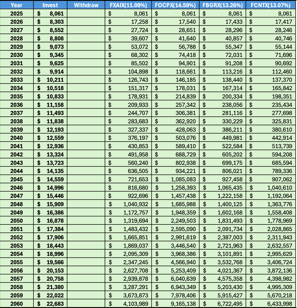 The potential for significant wealth accumulation is clear. A consistent 14.59% return, mirroring FOCPX's historical performance, could generate $1.9 billion. Even with more conservative S&P 500-like returns (FXAIX), they could achieve $221 million when the person become 100 years old.