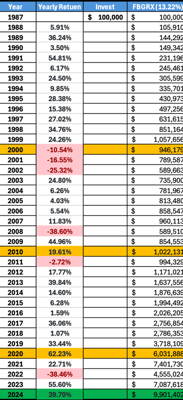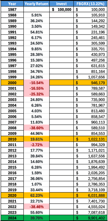 With 13.22% return, FBGRX turned $100,000 to $9.9 million dollars till end of 2024.