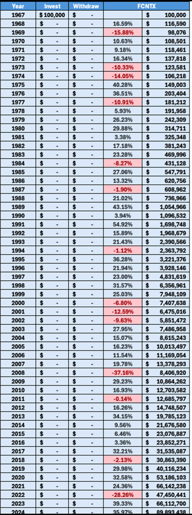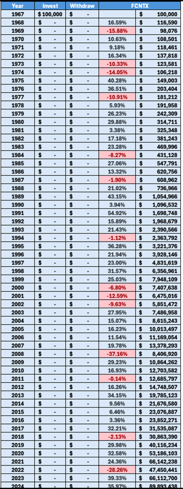 Above calculation is without dividend. FCNTX turned $100,000 to $89 million dollars till end of 2024.