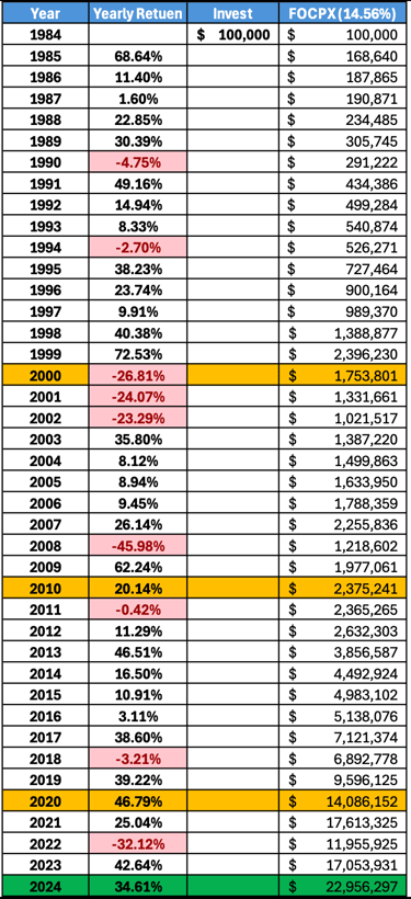 With 14.56% return, FOCPX turned $100,000 to $22.9 million dollars till end of 2024.