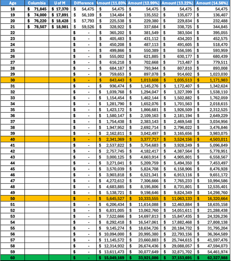With 11.03% return, Alex would have $15 millions+ and with 14.56% return it will be $62 million dollars+ when Alex will be celebrating his 60th birthday.